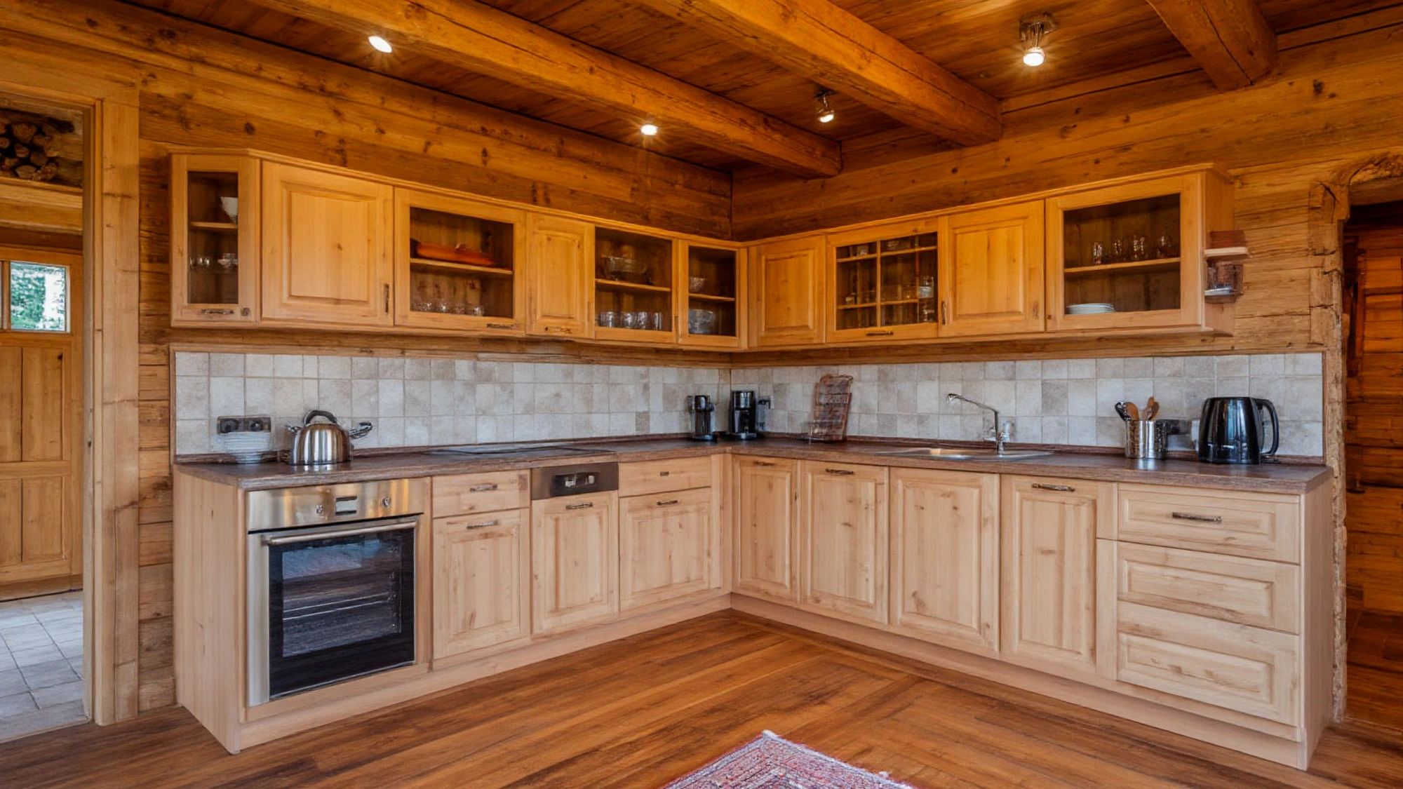 Кухня из пластика "Люцерна" сочетает в себе преимущества современного материала и традиционной эстетики шале. Пластик лёгкий, прочный, устойчивый к влаге, ударам и перепадам температуры, при этом визуально практически не отличается от натурального дерева. Это позволяет сочетать практичность и долговечность с уникальной эстетикой, свойственной шале.