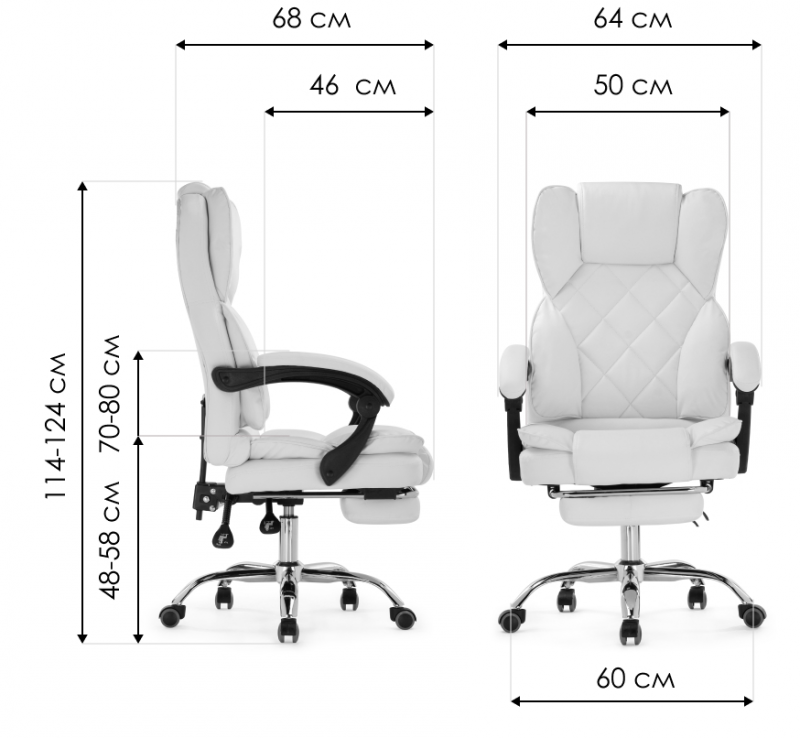 Высота подлокотников: 70 - 80 см. Диаметр крестовины: 60 см.